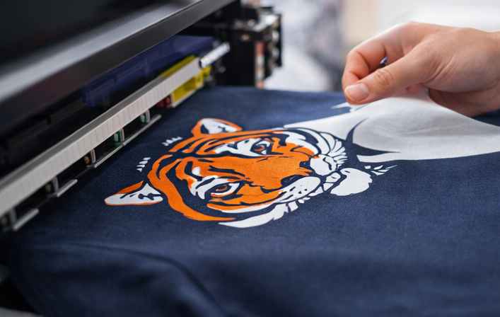 Nowoczesne technologie druku pośredniego na tkaninie. Pozwala na pełnokolorowe nadruki i bardzo wysoką szczegółowość (DTF).